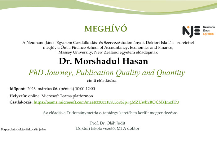 A Neumann János Egyetem Gazdálkodás- és Szervezéstudományok Doktori Iskolája szeretettel meghívja Önt Prof.univ.dr. Dan-Cristian DABIJA, a Babes-Bolyai University Romania; Faculty of Economics and Business Administration professzorának előadására.